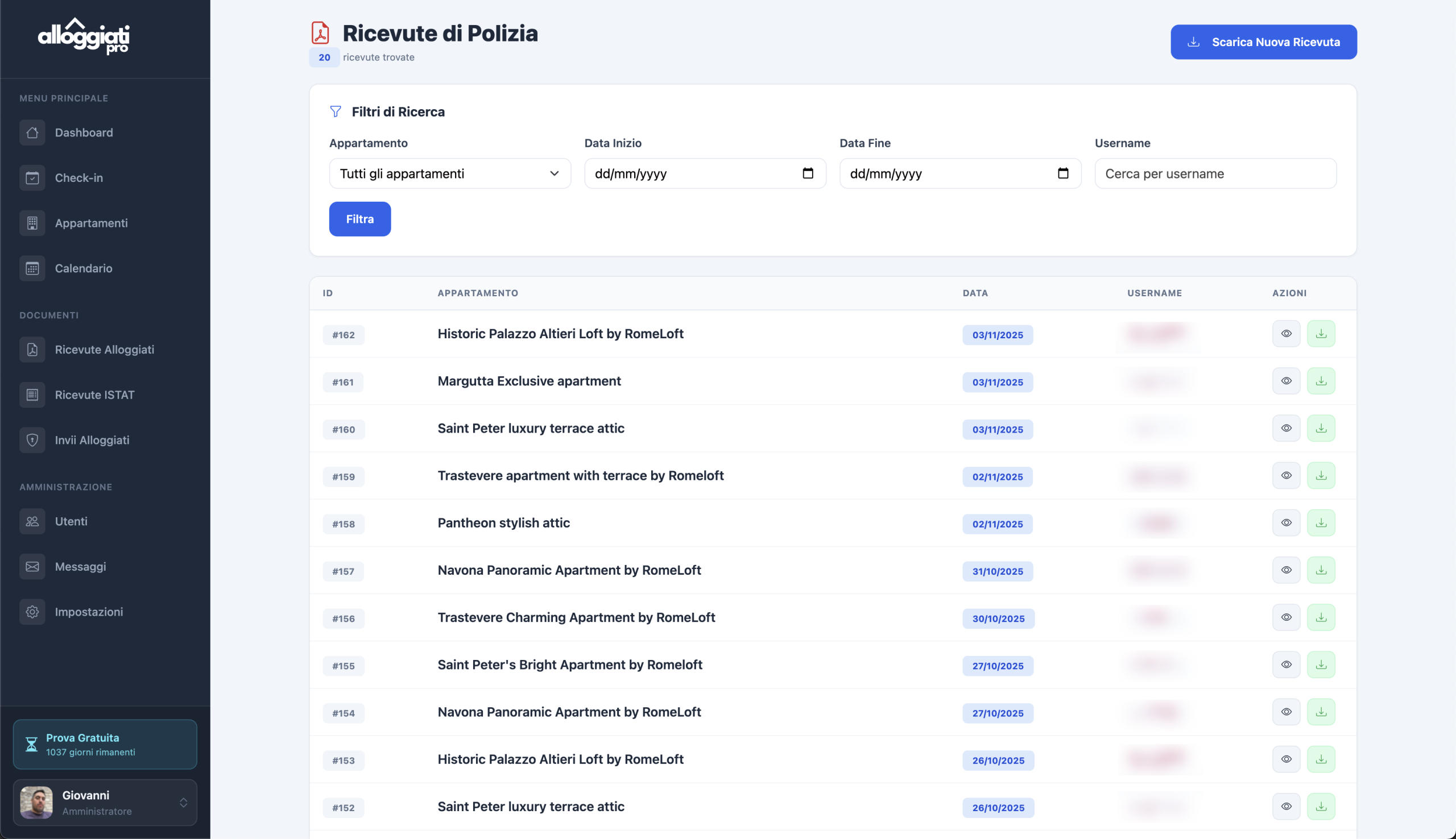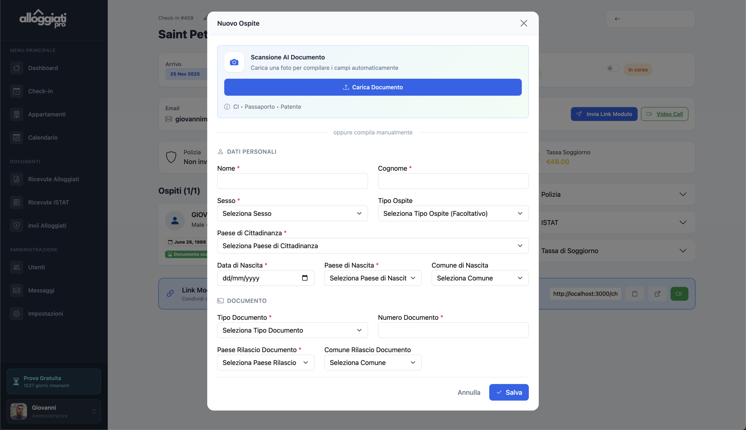 Aggiungi e gestisci appartamenti illimitati con credenziali ISTAT e Alloggiati Web personalizzate per ogni struttura.