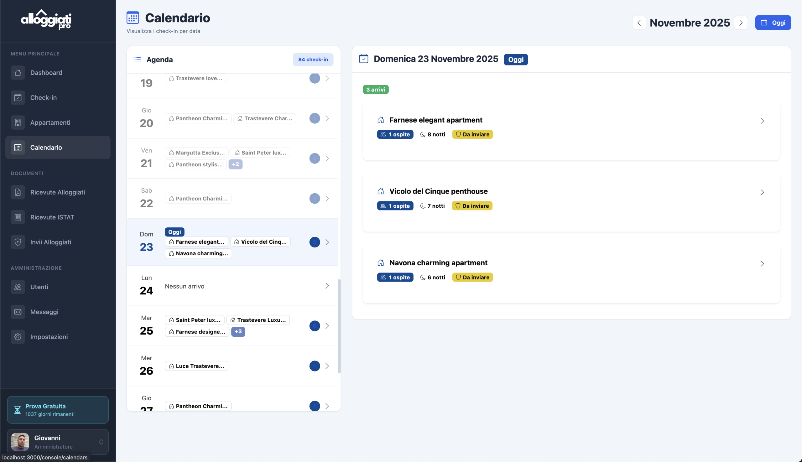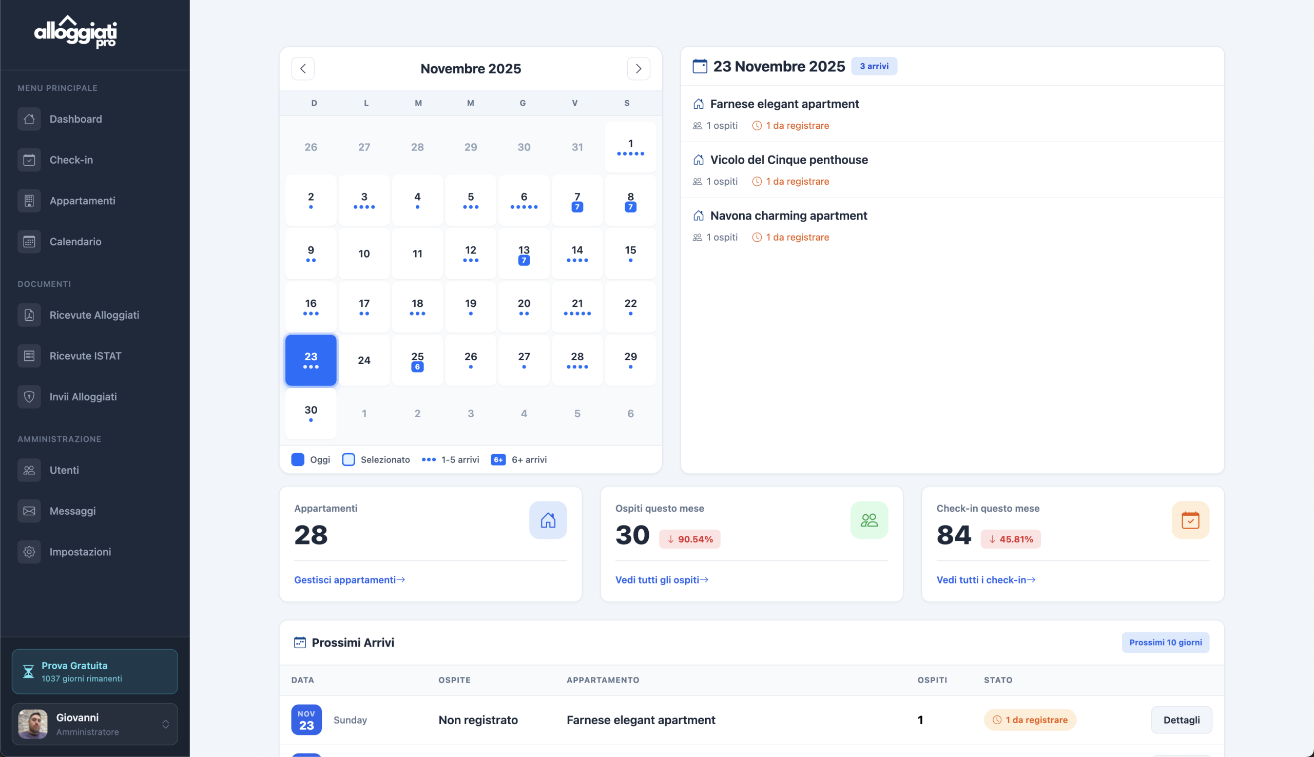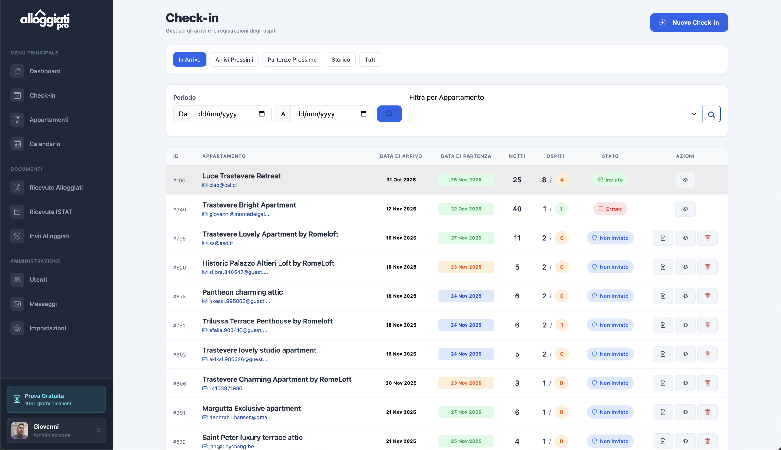 Monitora tutti i check-in passati e futuri con stato in tempo reale delle comunicazioni alla Polizia, ISTAT e form ospiti.